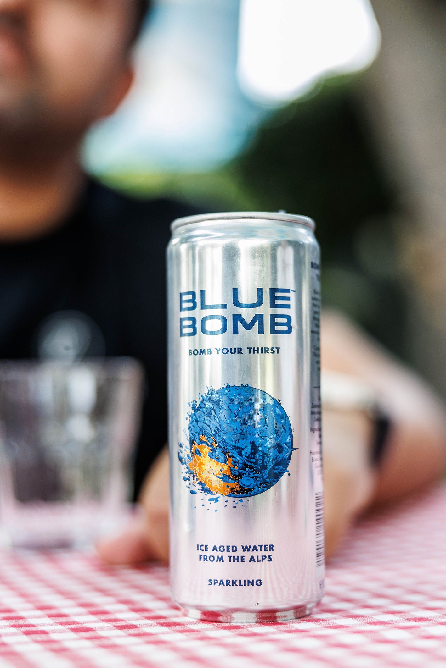 BLUE BOMB can. The young crowd loves the modern packaging and is drinking more water than ever before.